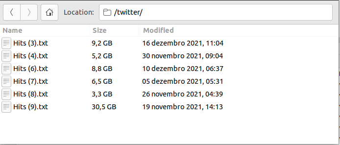 Esse vazamento foi disponibilizado através de um arquivo .rar que contém 6 arquivos de texto dentro, que totalizam 63.5gb de dados. Nestes arquivos são encontrados: Email, nome, ScreenName(nome que aparece na conta do twitter), seguidores(Followers) e data de criação da conta. Analisando o arquivo rar podemos ver que os arquivos contidos foram gerados entre novembro e dezembro de 2021.