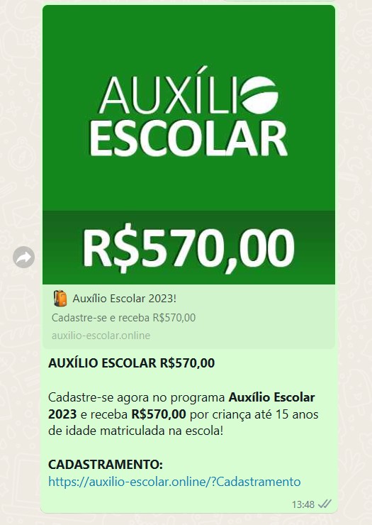 Tem circulado nos últimos dias uma mensagem no WhatsApp prometendo liberação de um valor de R$ 570,00 para quem for beneficiário do bolsa família, mas na verdade se trata de mais um golpe.