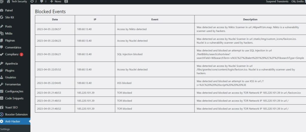 Além disso, é possível acompanhar todos os bloqueios e ações realizadas na area de logs da interface administrativa do plugin: