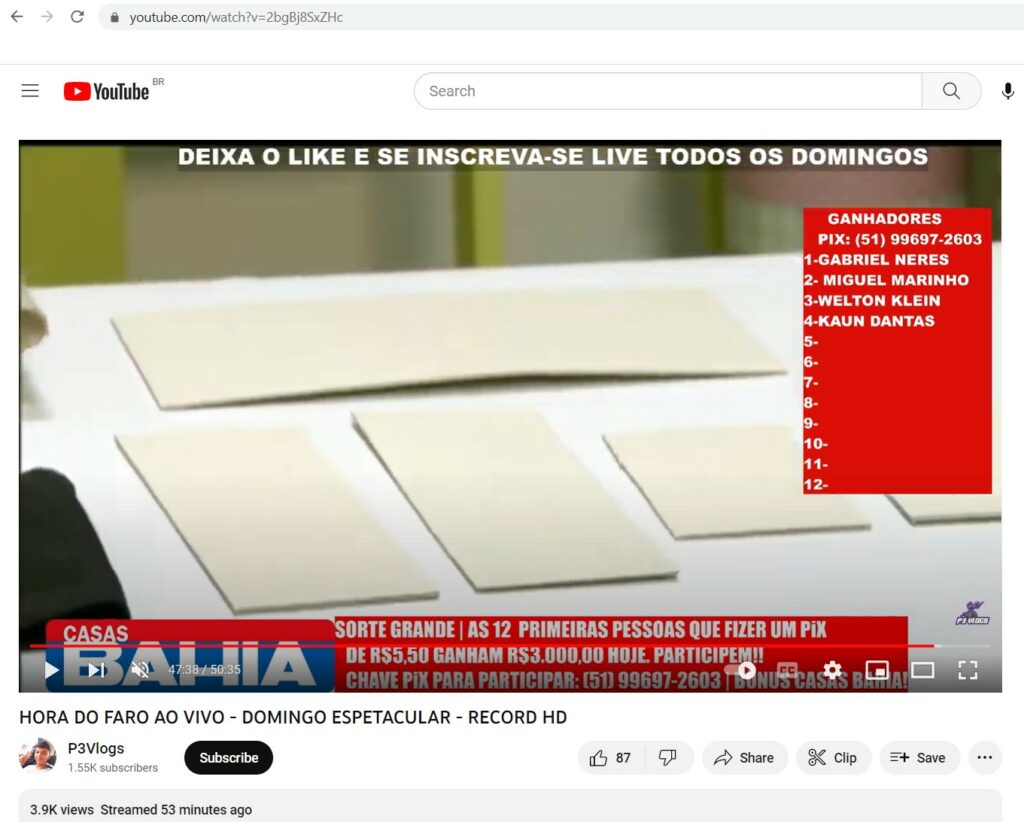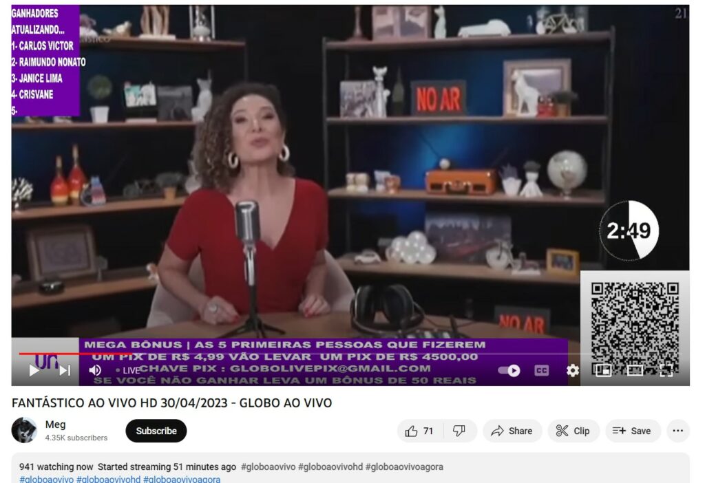 Cibercriminosos têm aproveitado a audiência de programas de destaque, principalmente das emissoras Globo e Record para criar transmissões ao vivo no YouTube, onde aplicam golpes prometendo sorteios de valores via PIX. Os vídeos ficam pouco tempo no ar, geralmente durante a exibição dos telejornais Fantástico e Domingo Espetacular, e enquanto transmitem ao vivo aos programas para uma grande audiência, os golpistas prometem grandes quantias de dinheiro através de sorteios. Para convencer as vítimas, os nomes de grandes marcas como Magazine Luiza, Nubank e Casas Bahia são utilizados indevidamente.